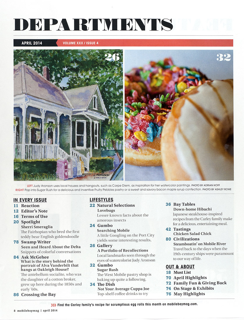 A Portfolio of Recollections Watercolorist Judy Aronson manipulates pigment on paper to bring local landmarks to life. Mobile Bay Magazine, Gallery, April 2014. Text and photos by Adrian Hoff