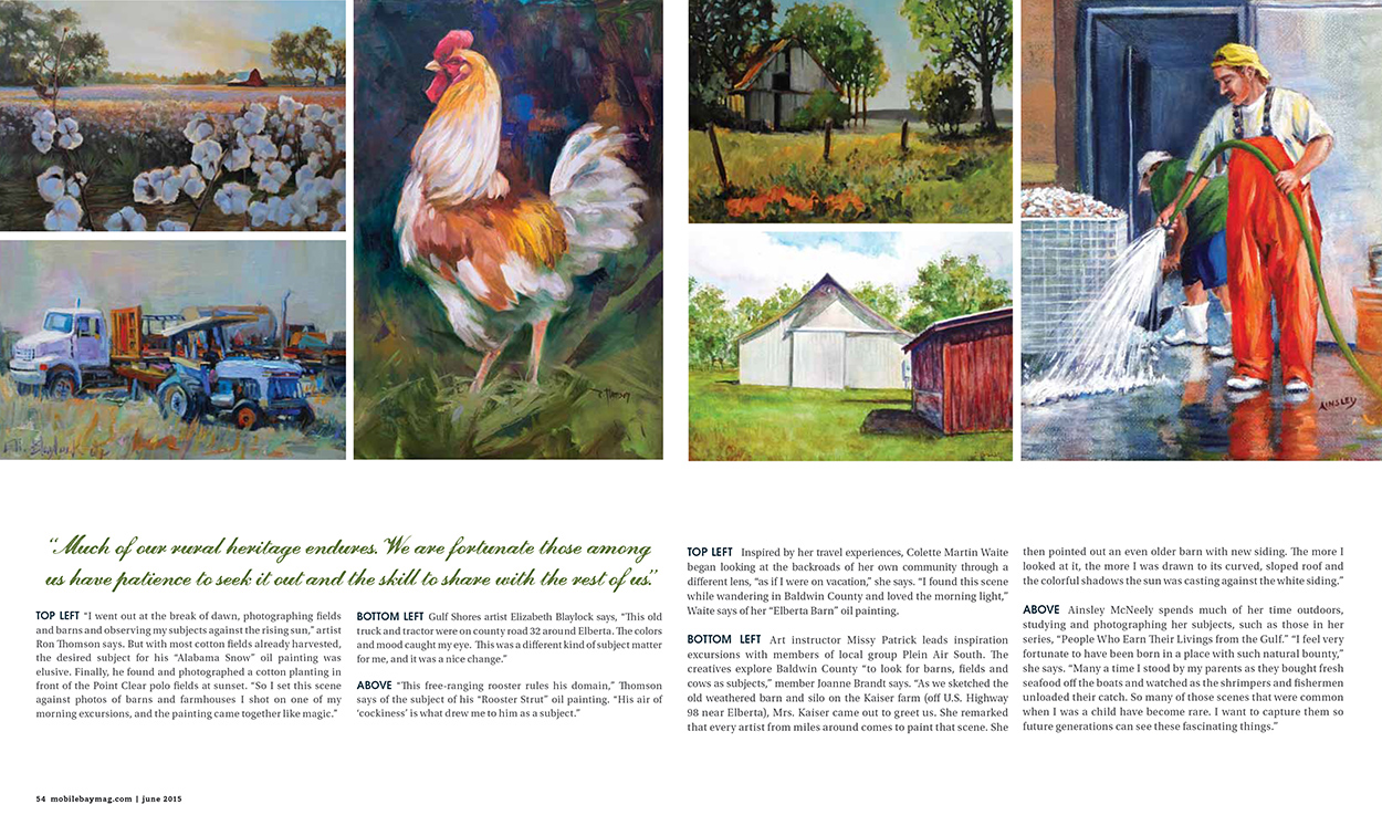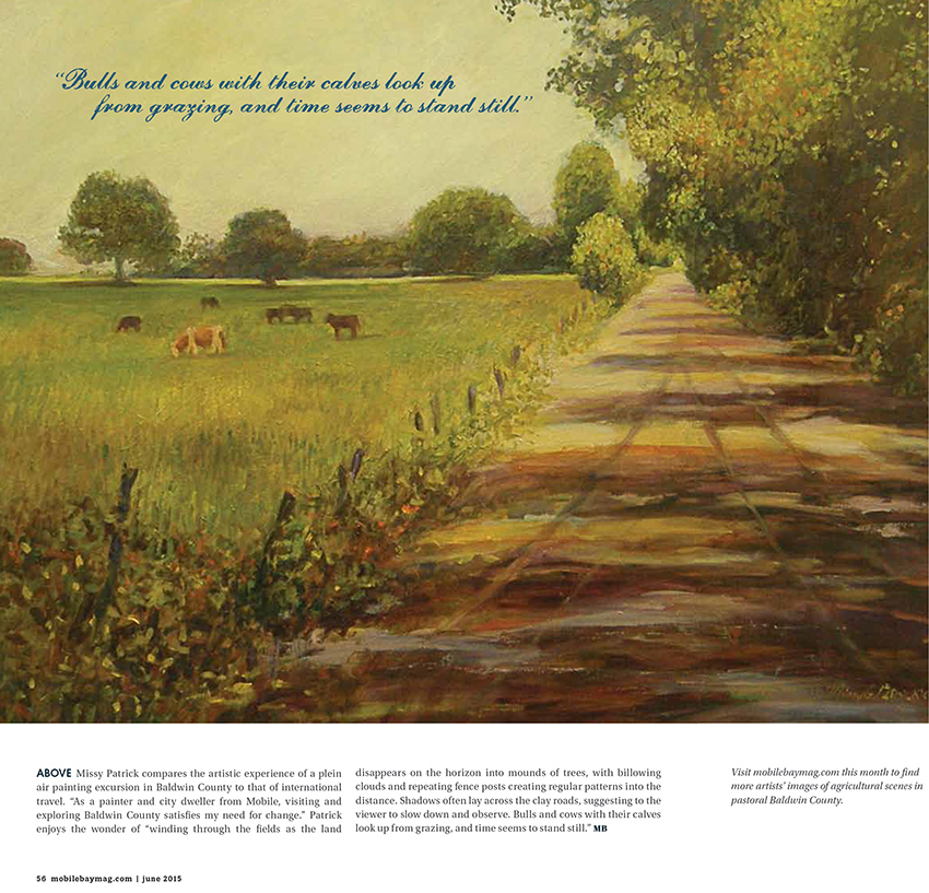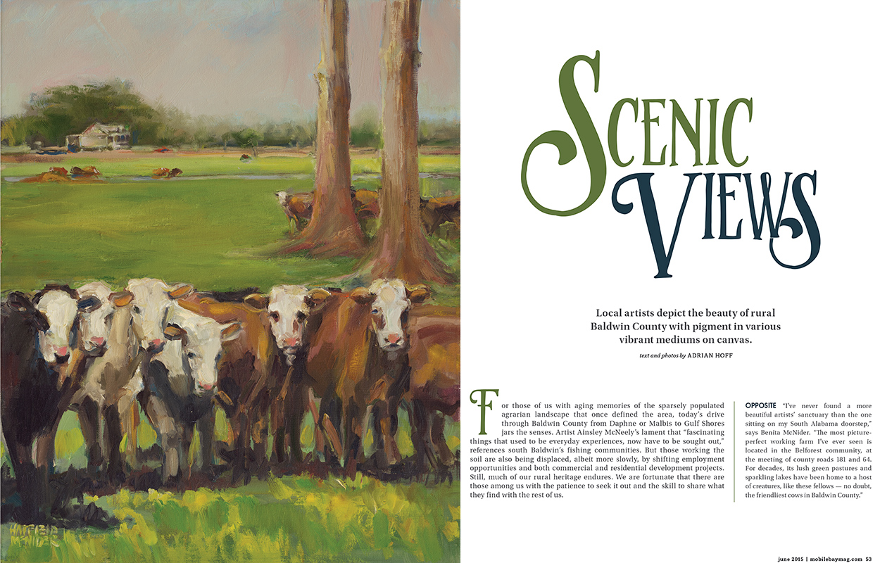 Scenic Views Local artists depict the beauty of rural Baldwin County with pigment in various vibrant mediums on paper and canvas. by Adrian Hoff. Mobile Bay magazine, June 2015. |