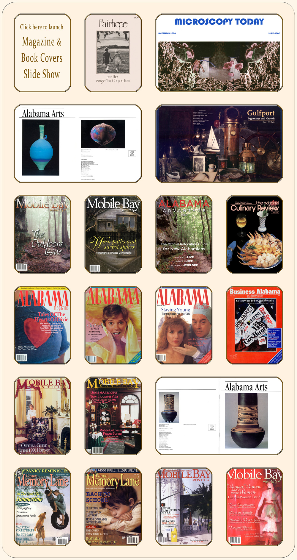 The Microscopy Today medical journal cover is pure fantasy. I created it in Photoshop in response to the editor's request for digitally manipulated montage images built from multiple microscopy photos. The final four (2 Down Memory Lane / 2 Mobile Bay Monthly) covers showcase artwork. I do not paint. One of the paintings I photographed to illustrate that issue's Gallery made the cover: a fairly common occurance. To date my Gallery articles have produced 15 covers — most recently, Mobile Bay Monthly's June 2010 issue. |
